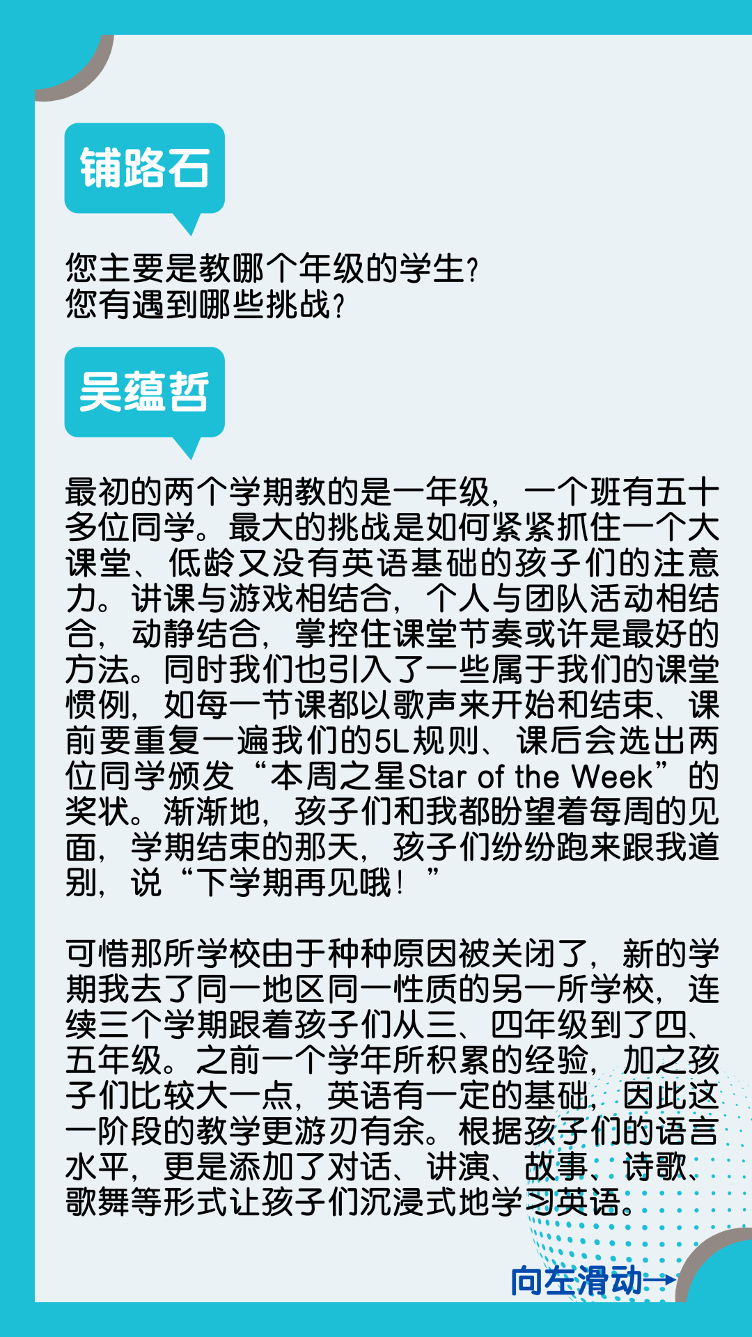 吴蕴哲,自2022年9月起成为铺路石线下英语教学志愿者。到2024年年末,她已经持续做了五个学期的志愿者。近日,小石子采访了吴老师,和她聊了聊她这五个学期的经历和感受。请与小石子一起走进这场关于成长、回馈与希望的访谈,聆听吴老师与孩子们之间那些触动心灵的故事,感受志愿力量带来的熠熠光辉。
